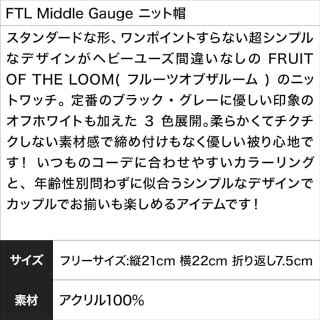 ニット帽 メンズ 帽子 フルーツオブザルーム FRUIT OF THE LOOM おしゃれ カジュアル 暖かい 防寒 シンプル 無地 ブランド FTL Middle Gauge (514585) フリーサイズ :Mグレー