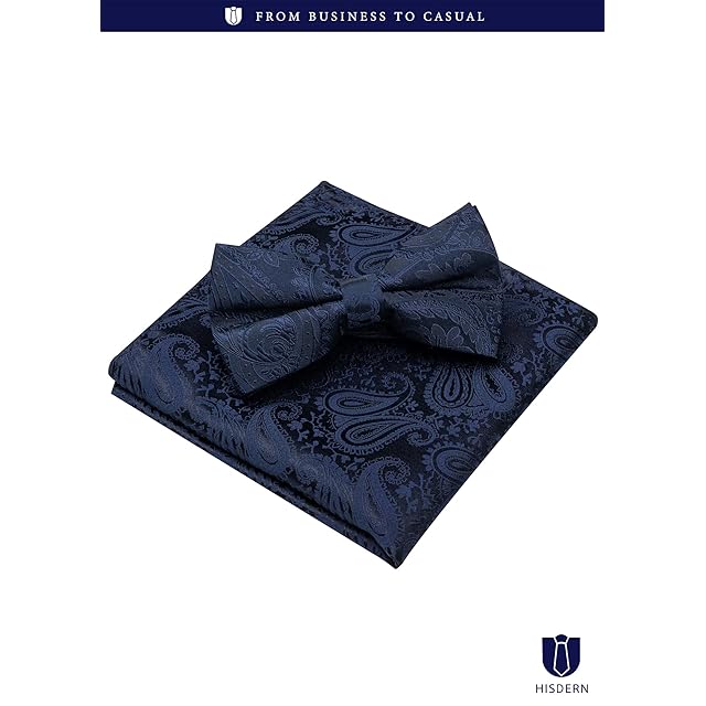 [HISDERN] ネイビー 蝶ネクタイ 大人 メンズ ワンタッチ 結婚式 チーフ セット フォーマル ペイズリー柄 紺 ボウタイ 簡単着脱 調節可能 bowtie BR-01