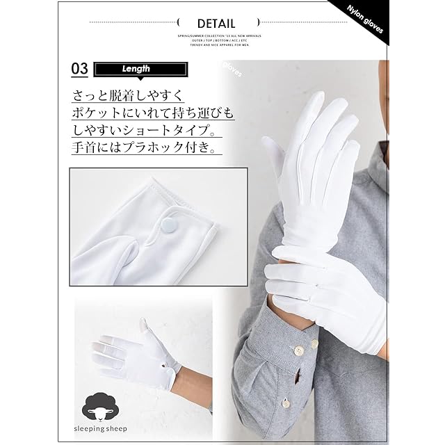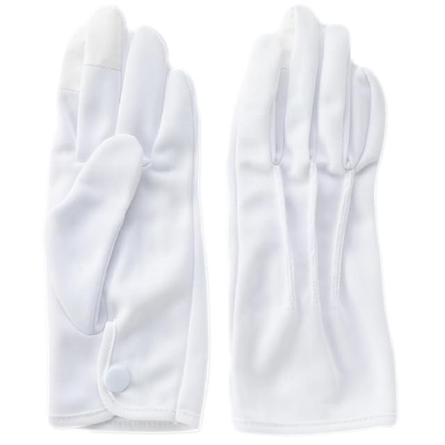 品よく見せてくれるアイテムなので接客業、警備員、警察、鉄道、観光バス、選挙用、冠婚葬祭に好適。コスプレなどにも使えると人気のホワイトグローブです。