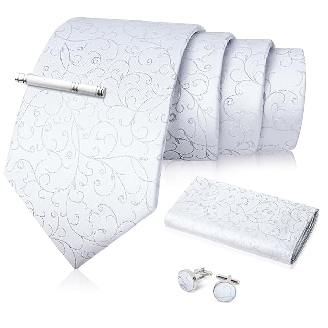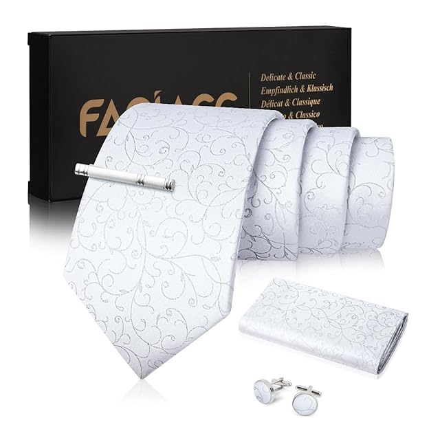 [FACIACC] 結婚式ネクタイメンズ シルク ネクタイ チーフ タイクリップ カフスボタン4点セット ハンカチドット フォーマル 高級 紳士 礼服 ビジネス 就活 入学式 卒業式 忘年会 ギフトボックス付き 手洗い 水玉 幅8.5cm全長150cm父の日Father's Day スーツ(03シルバー藤柄)