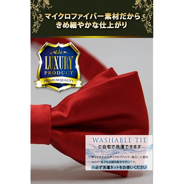 蝶ネクタイは自分で結ぼうとすると中々上手に結べません。本製品は蝶部分が糸で縫い付けて固定され、紐部分をフックで装着出来るようにしたワンタッチタイプの蝶ネクタイです。慣れない方でも簡単に装着できます。