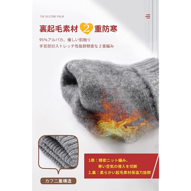 ⇒【高級素材 裏起毛 防寒防風】柔らかい肌触り、抜群な防寒保温性のあるアルパカを採用しており、表面はニットで裏面が細かく繊細な起毛素材を使ってるグローブです。ふわふわで手に着けた瞬間暖かく実感できます。快適な使用心地で、寒い冬に大切のお手を守ります。敏感肌にも優しくて、快適に使用できます。