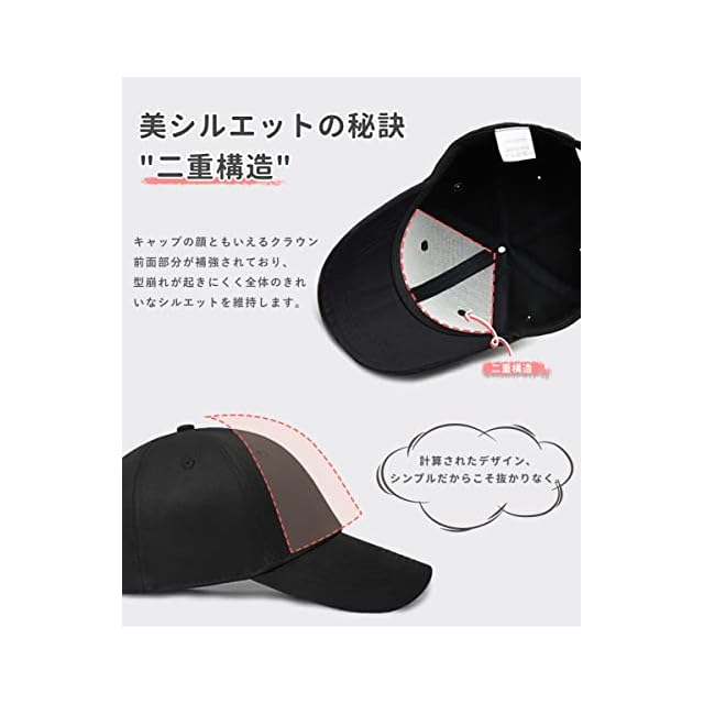 【ダブルファブリックが型崩れを防ぎます】きれいなキャップの形が長持ちするよう、キャップ前面部分の内側はダブルファブリック構造になっています。キャップの顔ともいえるクラウン前面部分が補強されており、型崩れが起きにくく全体のきれいなシルエットを維持します。ファッション性、実用性兼備の大きいサイズ野球帽。