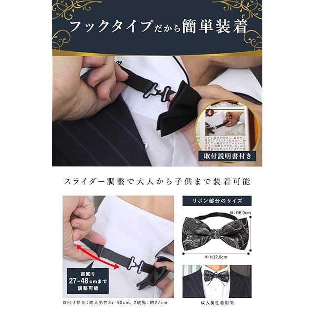 蝶ネクタイは自分で結ぼうとすると中々上手に結べません。本製品は蝶部分が糸で縫い付けて固定され、紐部分をフックで装着出来るようにしたワンタッチタイプの蝶ネクタイです。慣れない方でも簡単に装着できます。