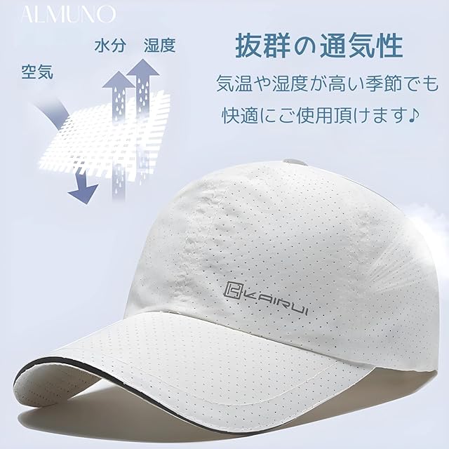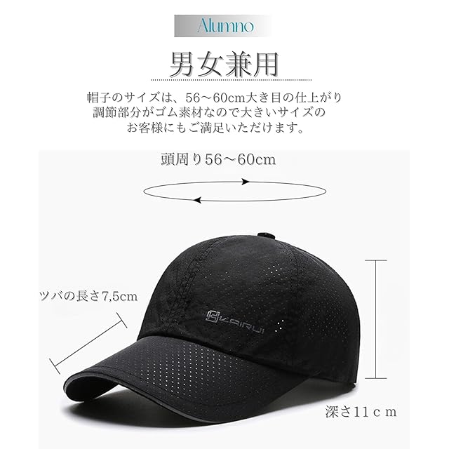 後ろの調節部分はゴム素材を使用して抜群のフィット感に仕上がって、汗を吸収しても速乾性に優れた素材を使用していて乾きが早いので熱中症対策にも効果的です。