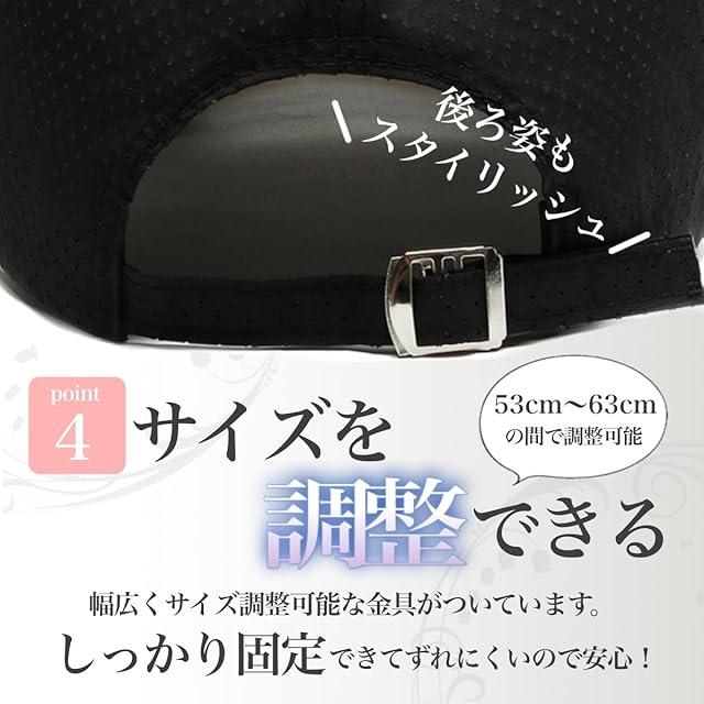【自分サイズに調整可能】 帽子の後ろにサイズを調節できる金具がついています。 金具タイプのため、使用しているうちにサイズが変わる心配もなく、しっかり固定できます。