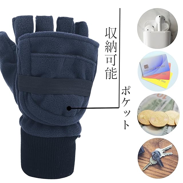 [Flammi(フレミ)] メンズ手袋 2WAY 半指グローブ 指なしミトン スポーツ手袋 防寒グローブ 防寒作業 通勤 通学 運動 冬用 (ネイビー)