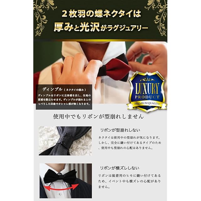 商品説明写真のとおり蝶部分は2つ折りの生地を更に2重にしてあります。装着に慣れない方でも全体の質感が良く見えるデザインに心掛けました。色味についてはイメージと違った場合、当店の保証をお使い下さい。