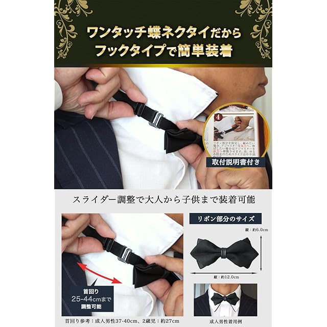 蝶ネクタイは自分で結ぼうとすると中々上手に結べません。本製品は蝶部分が糸で縫い付けて固定され、紐部分をフックで装着出来るようにしたワンタッチタイプの蝶ネクタイです。慣れない方でも簡単に装着できます。