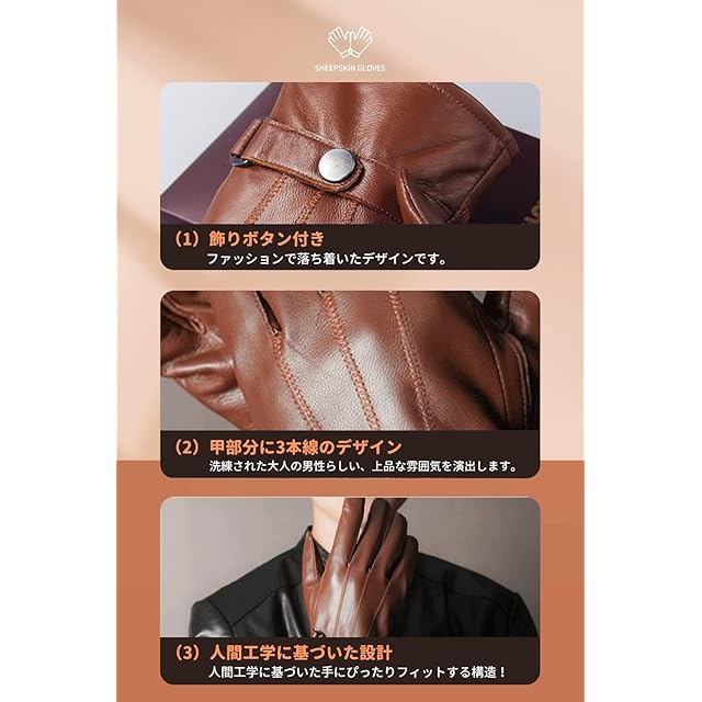 【こだわりデザイン】飾りボタン付き、ファッションで落ち着いたデザインです。甲部分に3本線のデザイン 洗練された大人の男性らしい、上品な雰囲気を演出します。また、人間工学に基づいた手にぴったりフィットする構造!