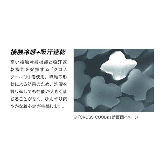 高い接触冷感と吸汗速乾機能を発揮する「CROSS COOL」を使用。繊維の形状による効果の為、洗濯を繰り返しても性能が大きく落ちることがなく、ひんやり爽やかな着心地が持続します。