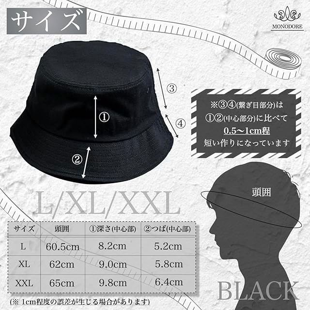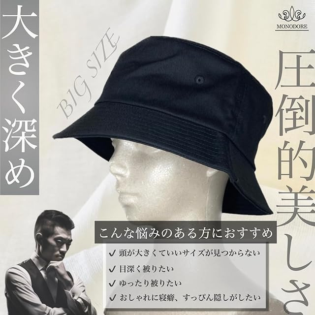[MONODORE] モノドーレ 大きいサイズ バケットハット メンズ バケハ 深め 帽子 ハット 大きめ 目深 レディース ビックサイズ 無地 コットン 綿100% (L)