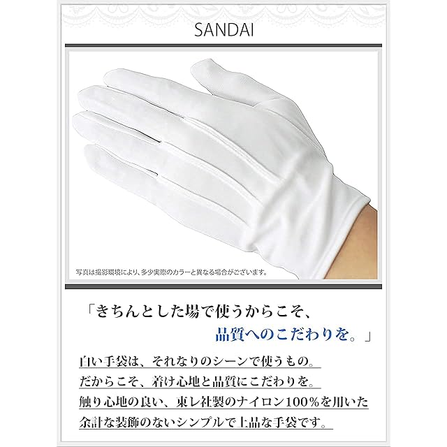 白い手袋は、それなりのシーンで使うもの。だからこそ、着け心地と品質にこだわりを。触り心地の良い、東レ社製のナイロン100%を用いた余計な装飾のないシンプルで上品な手袋です。