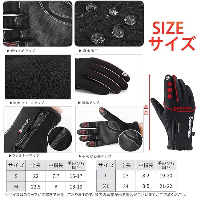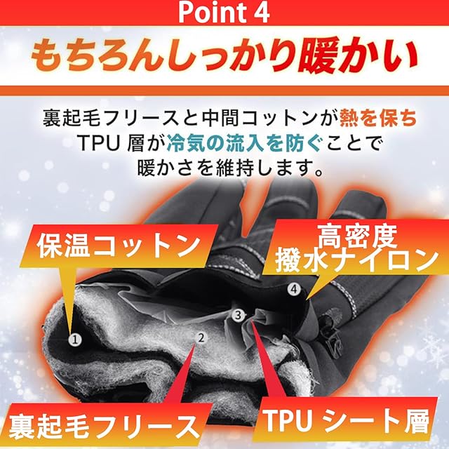 【高品質な素材】 高品質なポリエステル&PU&導電性ファブリックを採用する防寒手袋。3層構造で設計されており、手のひら表層は滑り止めPUレザー、裏には自発熱性抜群な裏起毛生地を採用し、防寒、防風、撥水加工、保温性、伸縮性、柔軟性、耐久性、通気性を兼備しています、着け心地の良い防寒グローブ、寒い季節の必需品です。