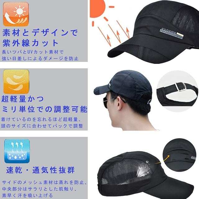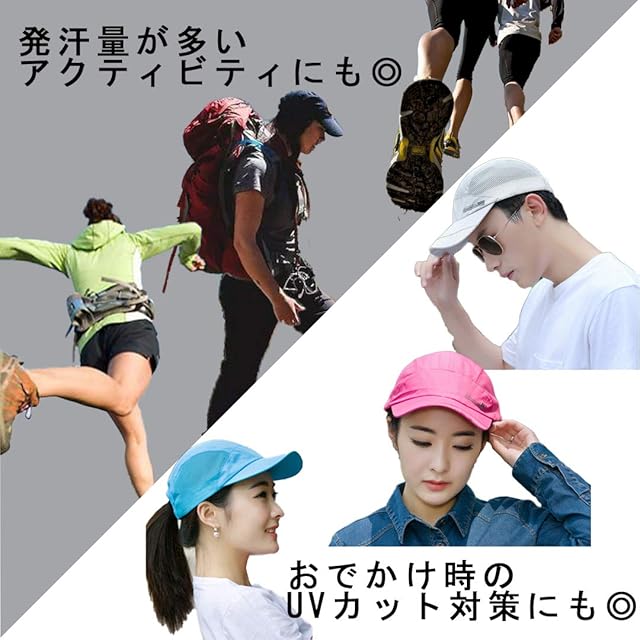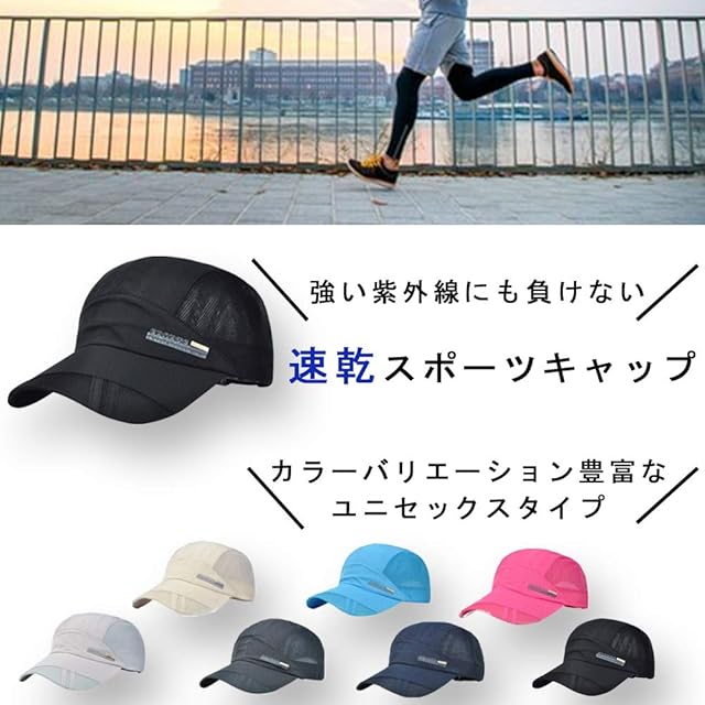 【紫外線対策】<br>紫外線をカットするUV素材で強い日差しによるダメージからお肌を守ります。<br>長くて、型崩れしにくいツバは野外でのスポーツや日中のおでかけに最適です。<br>【通気性・速乾性】<br>サイドのメッシュで蒸れにくく、本体はサラリとした肌触り。素早く汗を吸い上げます。<br>汗をかいても快適なかぶり心地です。<br>【超軽量・ストレスフリー】<br>つけているのを忘れるほどの超軽量なスポーツキャップです。<br>型崩れの心配もないので、折りたたんで、どこへでも持ち運び可能です♪<br>ジョギング、テニス、登山など発汗量の多いアクティビティから、旅行やちょっとしたお出かけにも、あなたのライフスタイルに合わせて快適にフィットします。<br>【シンプルでスタイリッシュなデザイン】<br>シンプルなデザインは様々なシーン、スタイルにマッチします。<br>長く広めのツバは日よけはもちろん、小顔効果も期待できます!豊富なカラーバリエーションで、その日の気分に合わせて楽しめます。<br>【素材・サイズ】<br>メイン素材:ポリエステル サイド:メッシュ地 サイズ:頭回り 55㎝~60㎝、ツバ部分 8.5㎝。<br>後ろのアジャスターでサイズ調整可能。男女を問わず、快適にお使いいただけます。