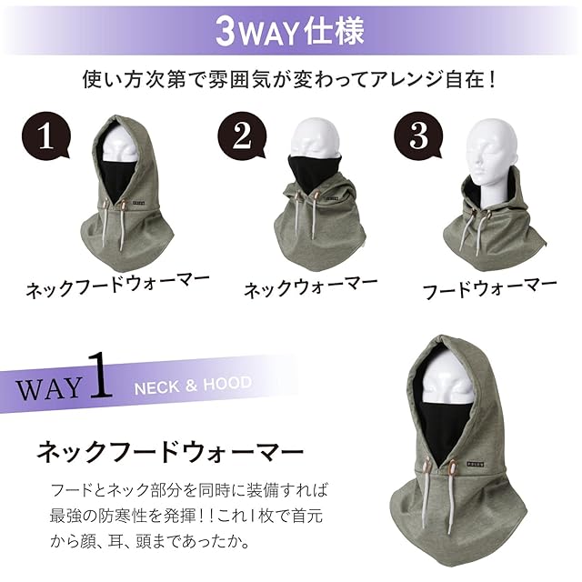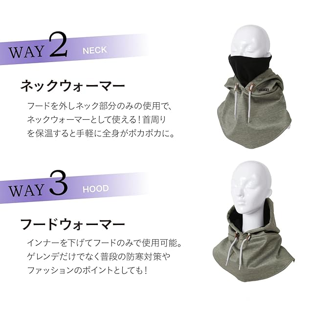 【3WAY仕様】使い方次第で雰囲気が変わってアレンジ自在!ネックフードウォーマー、ネックウォーマー、フードウォーマーと嬉しい3WAY仕様!首元から顔、耳、頭まであったかのネックフードウォーマー、首回りを保温すると手軽に全身がポカポカになるネックウォーマー、ゲレンデだけでなく普段の防寒対策やファッションのポイントとしても使えるフードウォーマー。