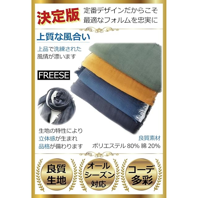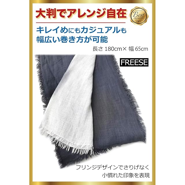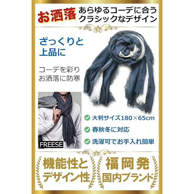✅【 アレンジ多彩な大判サイズ 】 長さ180cm・幅65cmと大判サイズのため、巻き方のアレンジに幅広く応用がききます。 【 3つの特徴 】●1,コーデに合わせやすいシンプルなデザイン→紳士用ストールとしてコーデに合わせやすいよう、無駄を省いたシンプルでクラシックな英国風モノトーンデザインを採用。フォーマルからカジュアルまでコーディネイトに合わせやすく、お洒落に仕上げます。 ●2,肌触りの良いコットン生地→質感の心地良さは、快適さを左右します。チクチク感や痛みのない、柔らかさを実現しました。薄手なので春 秋 冬 の3シーズンに対応します。 ●3,大判で巻きやすい→巻き方をアレンジできる長めかつ幅広の大きめ(ワイド)サイズ。メンズ・レディースを問わず、様々な巻き方を楽しめます。