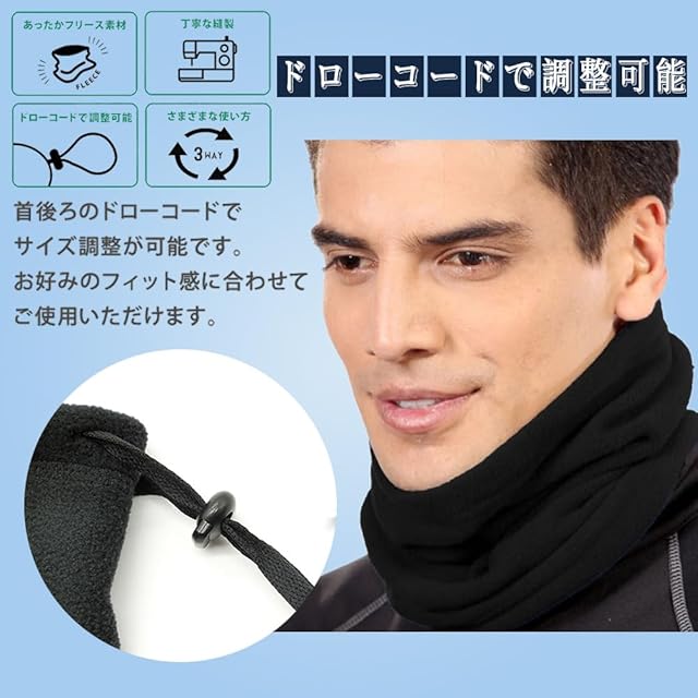 【調節コードつき】ドローコードが備わっており、サイズは52~60cmくらいで自分好みのフィット感に調節できるのが魅力。ネックガード全体軽い素材を採用、束縛がなくて締めつけ感ありません。寒い冬の出かける時紐を締め付けて更に防風効果アップ!そして、長いデザインで、鼻と耳までもしっかり保温できます。