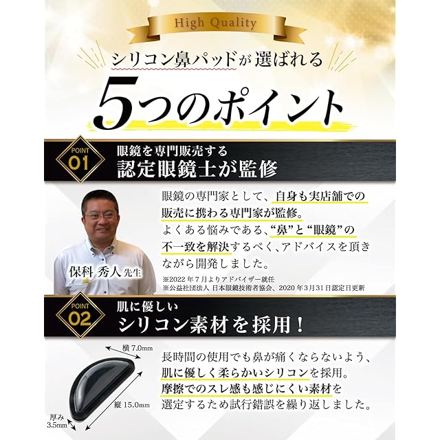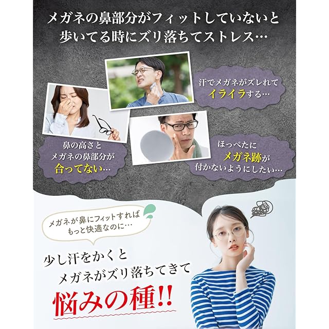 【認定眼鏡士が監修】汗でずり落ちてイライラする、鼻の高さと 眼鏡 の高さが合っていない、 メガネ 跡 が気になる、そんなお声から累計20万人以上の”目”に携わってきた専門家の監修の元、フィット感、快適さを追求した 鼻パッド です。