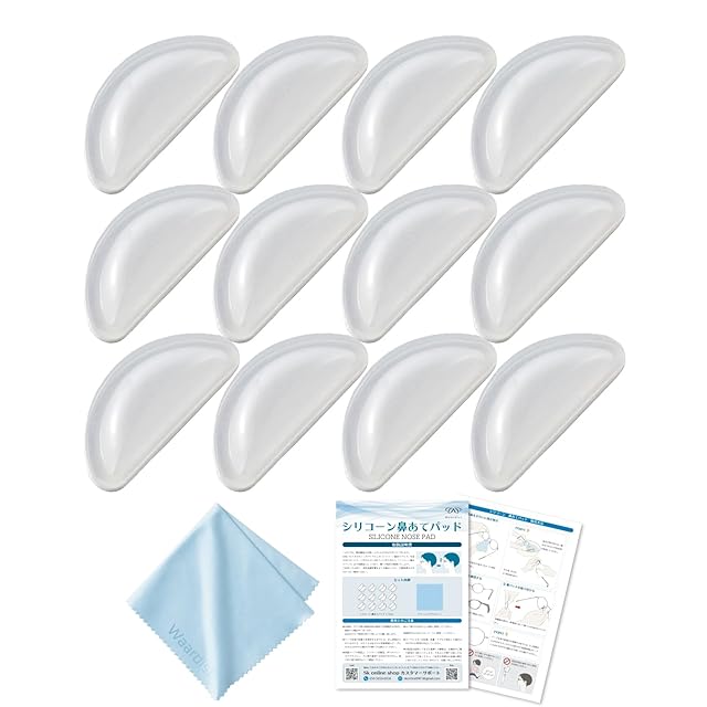 【サイズ/セット内容】 鼻パッド 縦14.6mm 横6.4mm 厚み3.5mm クロス 20cm×20cm 、 鼻パッド 12セット(24個) 、 クロス 1枚、 取扱説明書 1枚