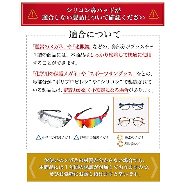 【注意事項】 「科化学用の保護メガネ」や「スポーツサングラス」などの鼻部分が”ポリプロピレン”や”シリコーン”で製造されている製品には、密着力が弱く不安定になる場合がございます。 お手持ちのメガネの材質確認のうえ、お買い求めください。