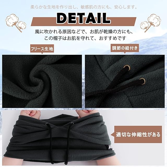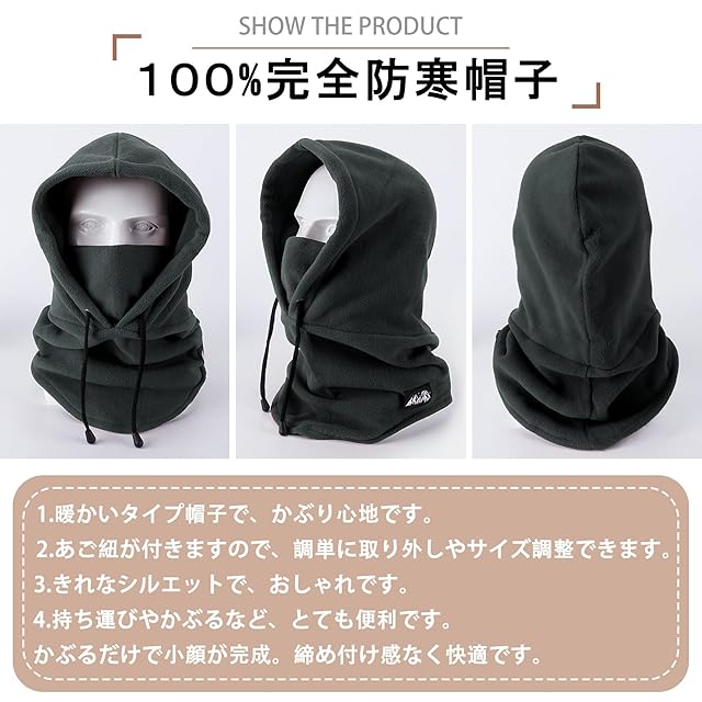 「フリース素材」伸縮性・保温性に大変優れたフリース素材を採用し、非常に柔らかく、ある程度の弾力性を持ち、首元から鼻、耳までしっかりカバー。寒い冬に外出時などの防寒防風対策に絶対おすすめ!商品サイズ(頭割りx高さx幅):69X55X33cm