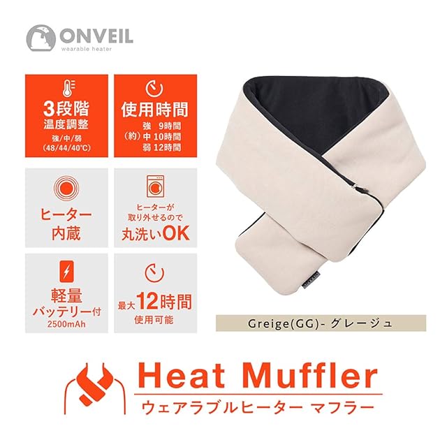 ドウシシャ ウェアラブルヒーター マフラー 充電式 USB 丸洗いOK グレイジュ ONVEIL(オンベール)