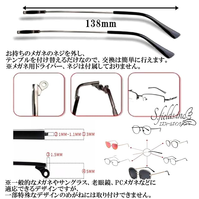 ほとんどのメガネやサングラス、老眼鏡、PCメガネなどに適応できるデザインですが、一部特殊なデザインのめがねには取り付けできませんので、掲載画像のサイズ、デザインをご参照ください。