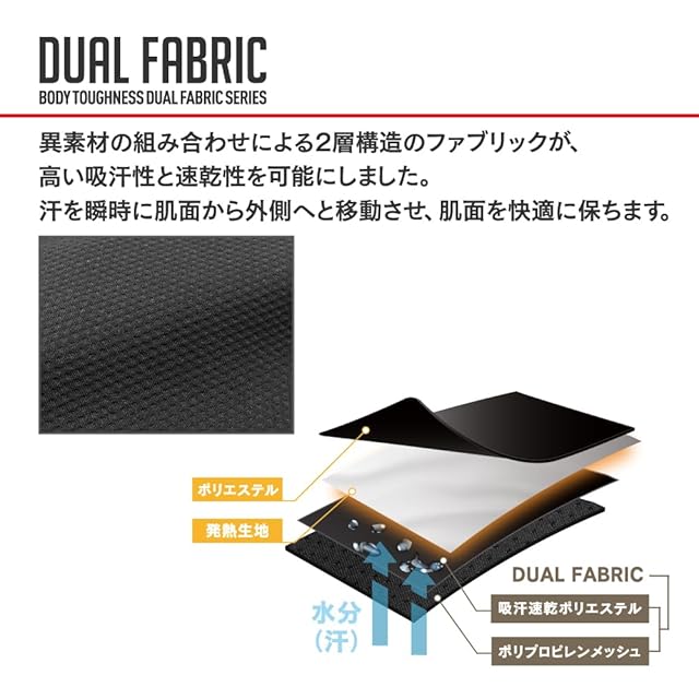 デュアルファブリック素材が汗を肌面から外へ逃がします