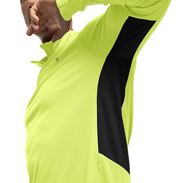 メンズ長袖:切り替えのデザイン、ファッションな配色。バックは夜間ランニング時の視認性と安全性を高める反射テープが付属しています。左侧腰部分は隠しポケット付きのランニングシャツ。