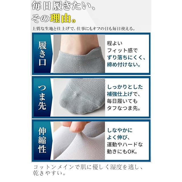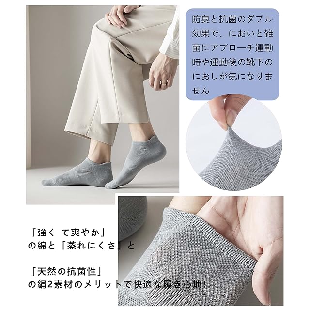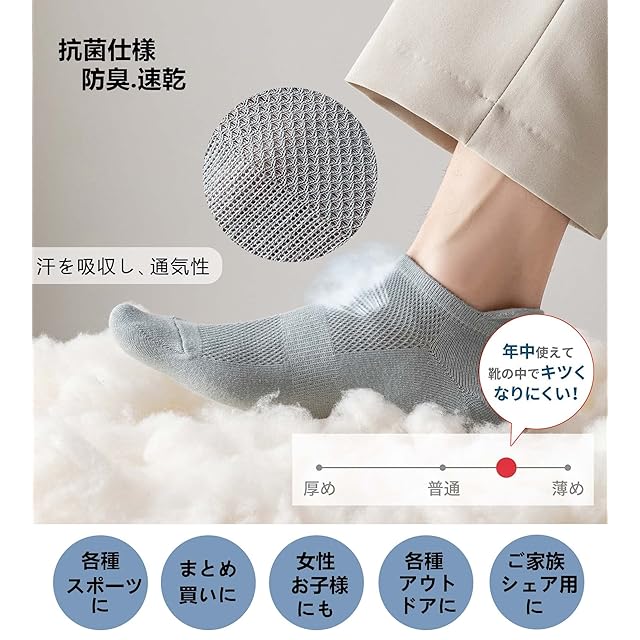 【抗菌防臭通気性】天然綿とポリエステル素材を採用したこのこれらのスタイリッシュな靴下,靴底は非常に柔らかく通気性があります,抗菌防臭の加工をされて、有効的に細菌の繁殖を軽減し、匂いを抑え、いつでも足の清潔を保ちます。