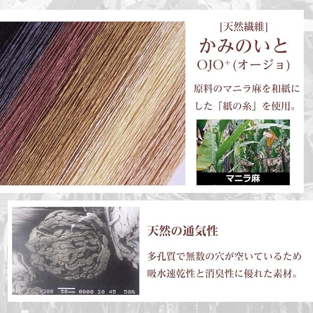 かみのいとソックスは自然由来の素材でありながら、驚きの通気性を実現! 「かみのいとOJO⁺(オージョ)」という自然の植物から作り出した糸を使用しております。 OJO⁺は繊維が多孔質で無数の穴があいているため、吸水速乾性が抜群。 原料にはマニラ麻という、水や熱に強い丈夫な線維がとれる植物を使用しています。 マニラ麻は耐久性が強く、日本ではエレベーターや、ケーブルカーのワイヤーロープの芯材や、身近なものでは紙幣にも使われています。 そのため「かみのいとソックス」は普段の靴下以上にタフな仕上がりで、簡単には破れません。 雨に濡れても乾きが早く、じめじめした気持ち悪さもありません。 だから、外出の多いビジネスマンも愛用しています。