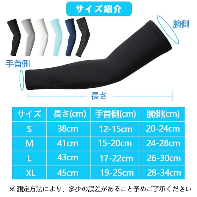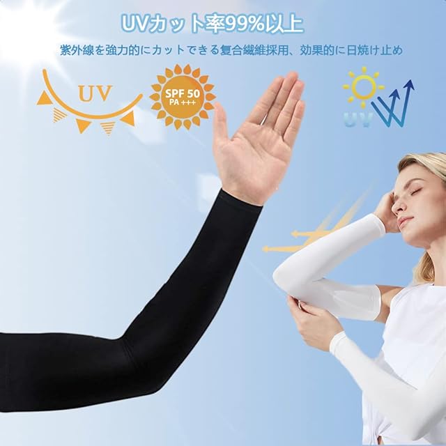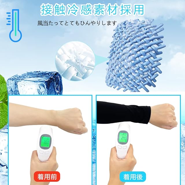 【素材構成】 92%ポリエステル+8%スパンデックスの高弾力繊維、接触冷感、UVカット率99%、伸縮性と通気性優れ、シリコン滑り止め付き;【適用対象】メンズ、レディース、男女兼用 、左右2枚セット;【サイズ】S、M、L、XL;【カラー】ブラック、ホワイト、グレー、ネイビー、ブルー。