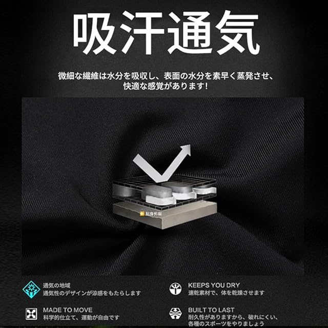 ポリエステル85%+ポリウレタン15%。吸汗速乾素材で、吸湿性や速乾性機能があるので、汗をかいても急速に蒸発できます。体を乾燥して快適に保ちます。