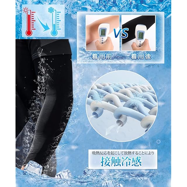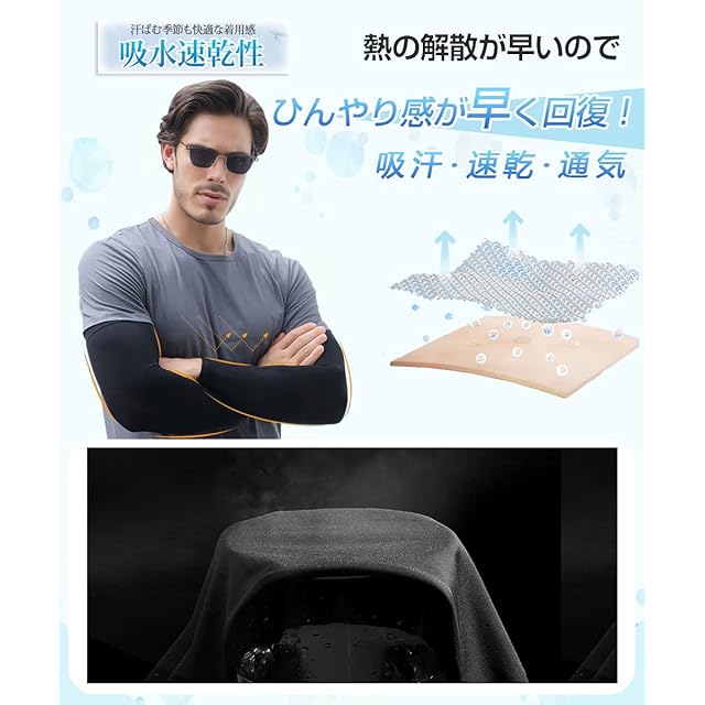 【通気速乾の冷感アームカバー】冷感素材と優れる通気性に合わせて、夏場に少しでも快適に過ごせるよう設計されました!通気性良い生地で、汗が素早かに吸収して発散でき、夏でも蒸れにくい、長い時間着ていてもベタベタな感じがなく、爽やかな使用感が実現できます。接触冷感素材なので、着けた瞬間からヒンヤリとした冷感が続き、ひんやりとした使用心地が夏用にぴったりです。