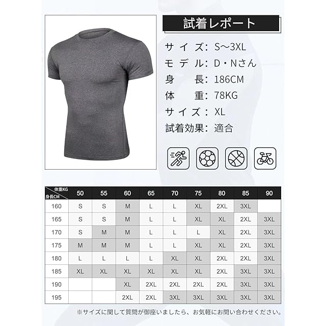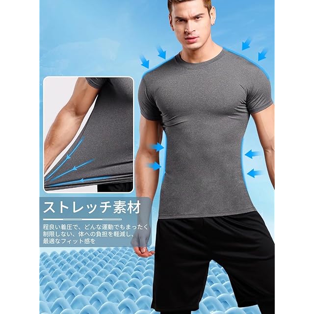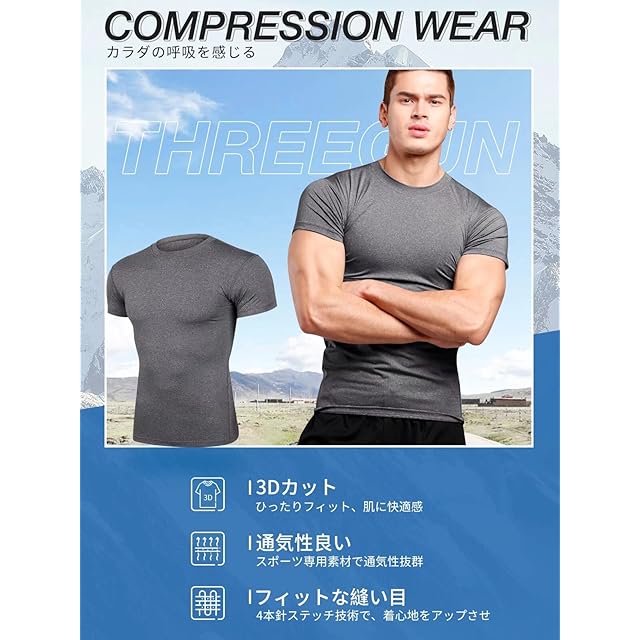 【THREEGUNスポーツインナー】半袖シャツは4方向ストレッチ素材を採用し、ストレッチ性が優れ、フィット感を保ちつつ体の動きを邪魔しません。スポーツ、日常生活をもっと自由になります。