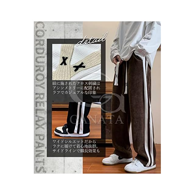 紐に施されたクロス刺繍はアシンメトリーに配置されラフでカジュアルな印象。ワイドシルエットだからラクに履けて着心地抜群。サイドラインで脚長効果も〇