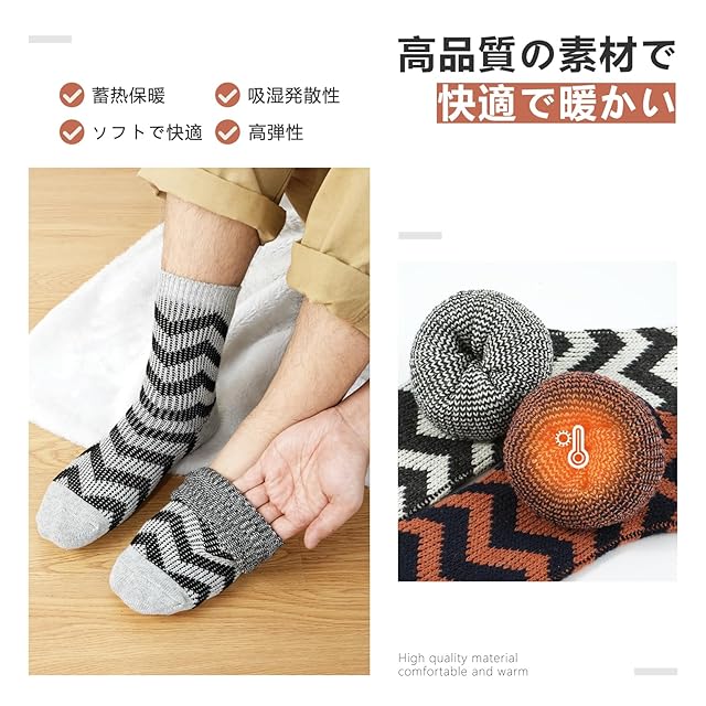 【秋冬適用暖かい靴下 メンズ 厚手】このメンズ靴下セットはスポーツシューズ、レザーシューズ、カジュアルパンツやスーツパンツでも、完璧にコーディネートできます。クォリティーオブライフを目指しているなら、この防寒ソックスメンズコットンは間違いなくもっとも良い選択肢となるでしょう。シンプルな色調、簡潔なデザインで、カラーは5種があり、服に合わせやすくて、お好きに選択できます。民族風な 靴下 メンズ 冬なので、シンプルだけでなく、ファションと高級感が満載で、スーツやカジュアルや服にもコンビやすい男性防寒クルーソックスです。あったかいウール靴下ですので、冬の日に自宅用も睡眠用もルームソックスとしておすすめですよ。
