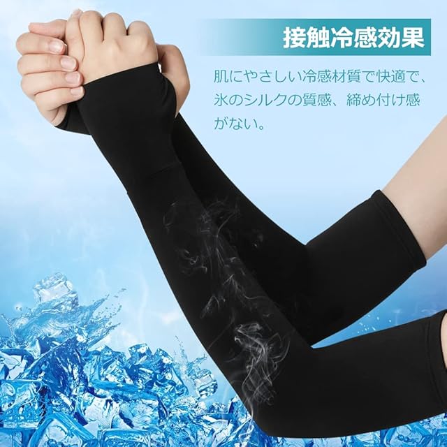 製品仕様:アームカバーの素材構成: 91%ナイロン+9%スパンでックス 紫外線UPF50+カットする素材を採用し、UVカット率99%以上、遮光遮熱、吸汗速乾 肌にやさしい冷感材質で快適で、氷のシルクの質感ですし、ひんやり素材で,やわらかく,なめらかな質感,肌心地が良く、夏でも、蒸れずにひんやり感が持続できます。