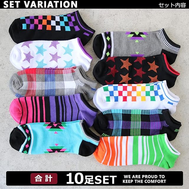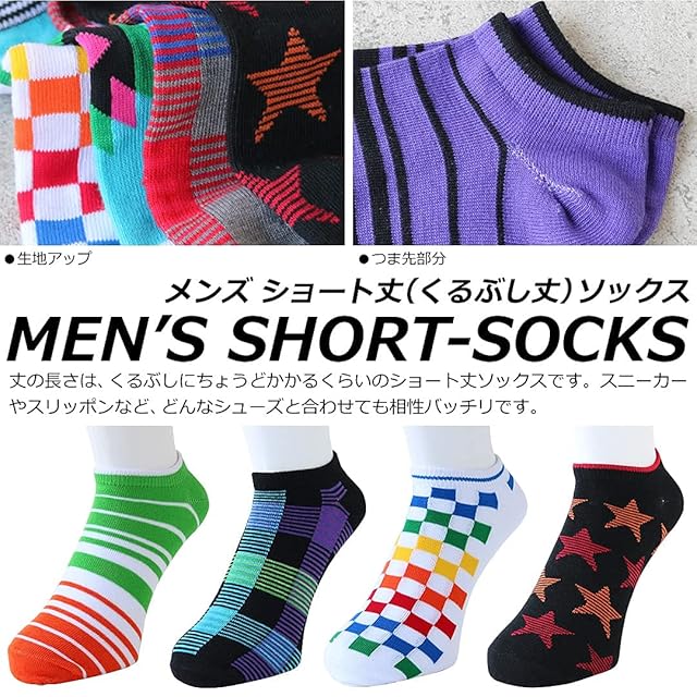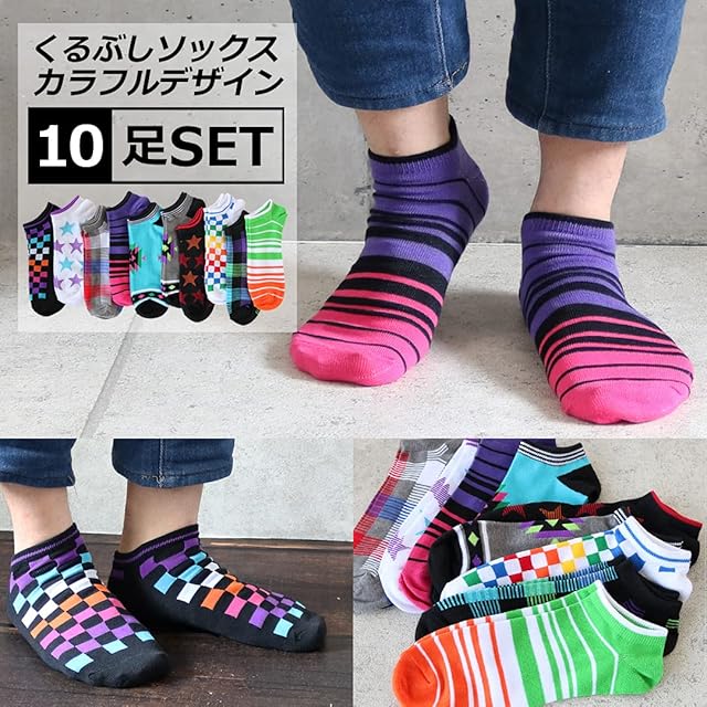 [box408] 靴下 メンズ くるぶし 10足セット ショート ソックス カラフルデザイン 25-27cmサイズ くつ下