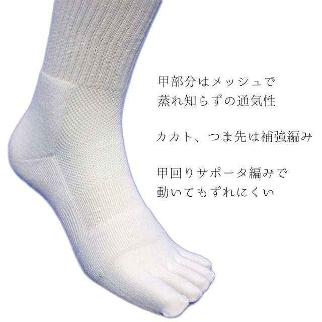 高級綿糸を使用し肌ざわりがよく快適な履き心地の靴下。 甲部分メッシュ編みで通気性バツグン。足底部分がパイル編みでクッション性がありソフトな履き心地。 底部分にある滑り止め加工で踏ん張りがきき、フィット感抜群で動きやすい。 波型すべり止めは山が低く、仕事やスポーツ、普段履きにも。 五本指タイプ3足組 カラー:白 サイズ:24.5~27cm