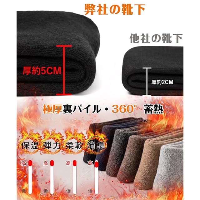 【極厚裏パイル・38℃恒温】靴下は丈夫な材料と丁寧な編み方で足全体フィットし、足にピッタリ、ズレにくいです。上質なウール質を採用して、裏地は極厚手起毛、保温性は普通の靴下の5倍、厳冬にアウトドアしても保温性が良い 靴下 メンズ 厚手。履き口からつま先まで全部ふわふわとして、まるで毛布に包まれているような、滑らかな肌触りで足全体をやさしく包み込んでくれるから、同時に厚地裏起毛のデザインを採用し、足の熱量をしっかりとロックさせて、不思議な38℃恒温を実現します。