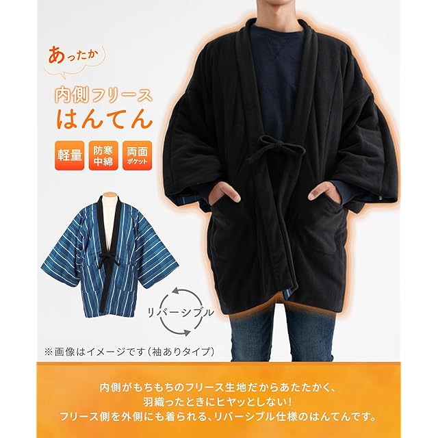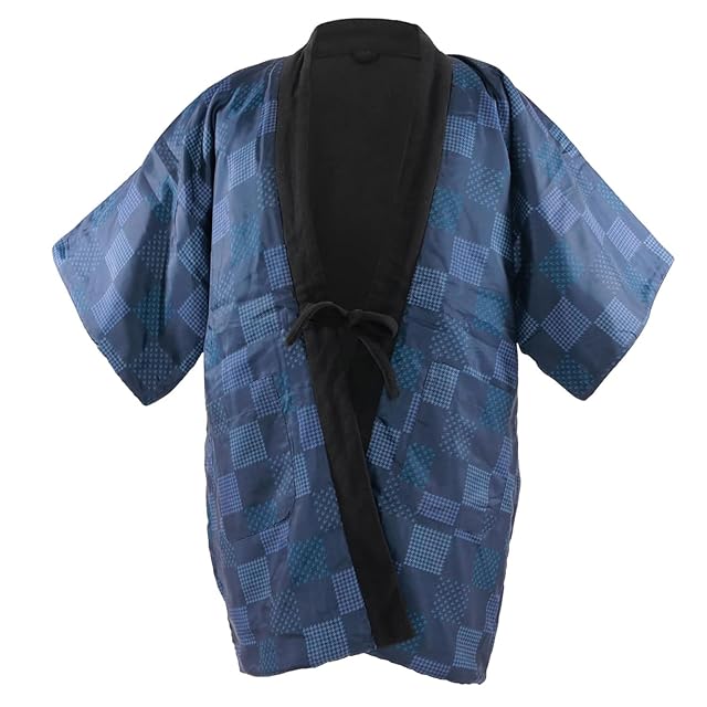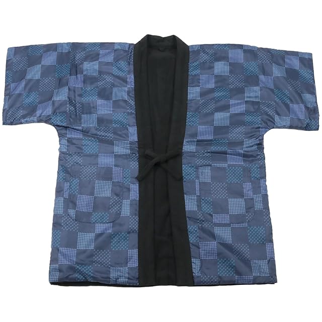 [KYOETSU] [キョウエツ] 半纏 はんてん 袖あり 袖なし 綿入り メンズ 冬 フリース C (袖なし, 10.紺市松(袖なし), M)