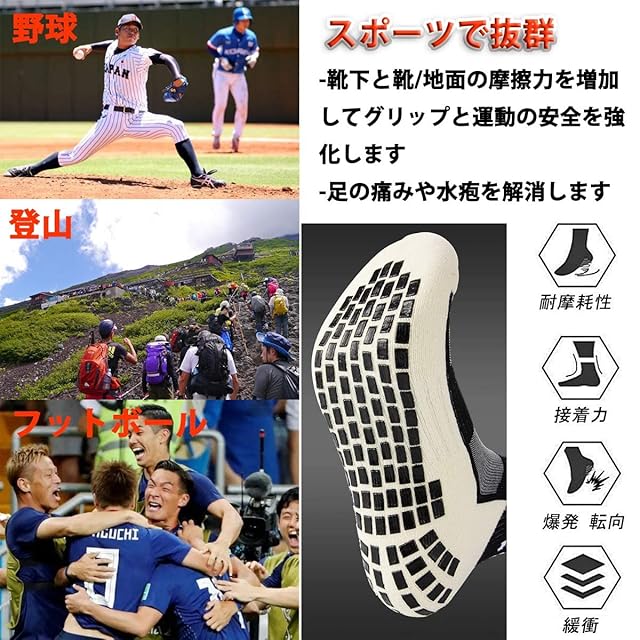 滑りにくい - グリップゴムトレッドはどんな状況でも安全と安心を提供します。独自のトレッドデザインにより、ほぼすべての路面で最大の牽引力を発揮します。トレッドは高品質で床を傷つけません。私たちの靴下は登山、 テニス、ゴルフ 、サッカー、サイクルソックス、トレーニング、マラソン、バスケットボール、バレーボール、釣り、野球、スキー、スポーツ競技、トレッキング、ゴルフ、ランニング、ハイキング、クライミング 、スポーツソックスで広く使用されており、スポーツでのパフォーマンスの向上に役立ちます。また、私たちの靴下は、仕事で頻繁に歩かなければならない人にぴったりです。例えば引っ越し業者の従業員、配達員、新聞配達、配達員、組み立て作業員、清掃員などです