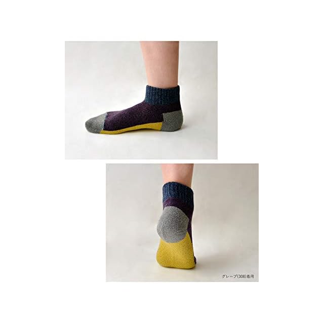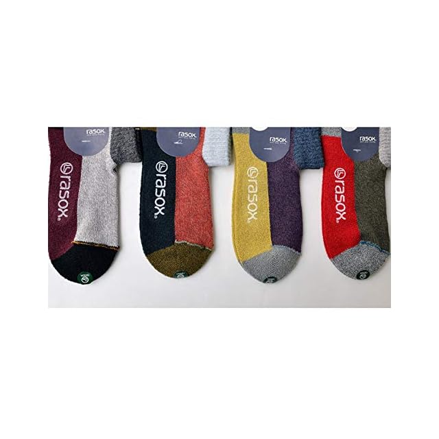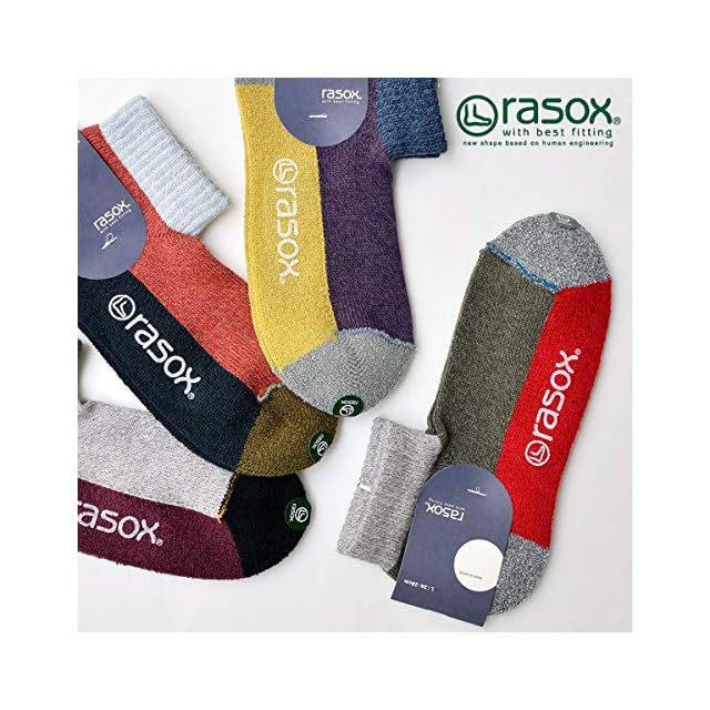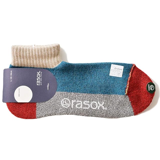 rasox(ラソックス)は「直角を基本に運動」する足の形を考えて直立時のカタチに合わせて編み込んだL字型一体成形編み靴下です。従来の靴下のように足裏面を引っ張ることなく 甲の弛みや踵の引き伸ばしを解消し、靴下全体からやさしく包み込まれるようなソフトなフィット感が得られます。吸汗速乾性に優れた糸を使用したブロック柄のアンクルソックスです。足底をパイル調にふっくらと編み込んでクッション性を高めています。また、つま先の縫い合わせを表側に出すことで、歩行時に不快と感じるつま先のゴロツキ感を解消する工夫をしています。