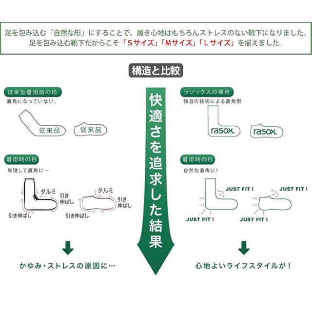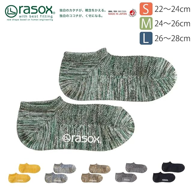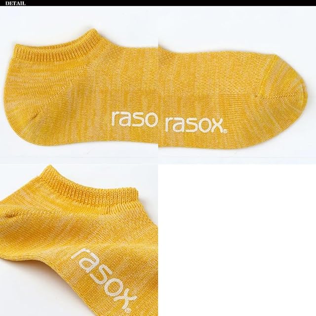 rasox(ラソックス)は「直角を基本に運動」する足の形を考えて直立時のカタチに合わせて編み込んだL字型一体成形編み靴下です。従来の靴下のように足裏面を引っ張ることなく 甲の弛みや踵の引き伸ばしを解消し、靴下全体からやさしく包み込まれるようなソフトなフィット感得られます。吸湿性・速乾性の機能を持つ接触冷感繊維ソフィスタと清涼感をもった強撚の綿を使用したスニーカーソックスです。甲部はメッシュ編みのため、通気性が高く暑い季節でも快適な着用をサポートします。春夏限定モデルです。