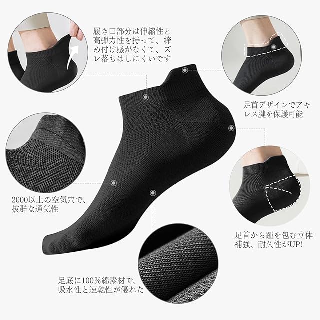 【一体型縫製・アキレス腱ガード付き】:メンズくるぶしソックスは足の形状に合わせてしっかりと一体化した縫製を採用し、かかと部と靴との摩擦を軽減しています。快適で耐久性も優れています。くるぶしを覆うサイズで、アキレスガード付けの立体構造でストレスを軽減でき、アキレス健を靴擦れ悩みから解放されます。。首部分が少し厚めに作られており、ベロが付いているため、これがスニーカーを履いた時の靴擦れを防止してくれて楽になります。
