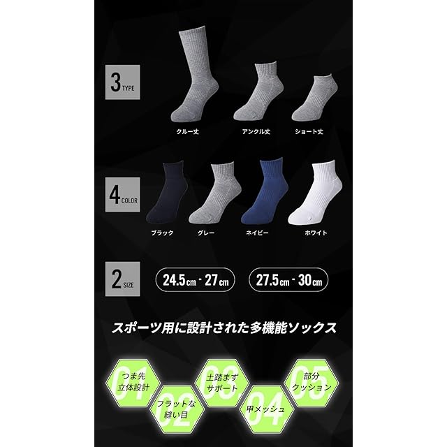 【あらゆる運動シーンに適した、オリジナルスポーツソックス】3つの特徴で運動パフォーマンス向上をサポートします。選べる3種類の丈×2サイズ×4色展開。