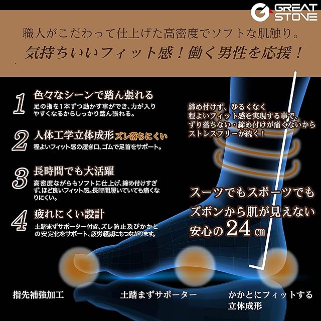 【商品スペック】 丈の長さはかかとから24cm、足の甲部分もしっかりと伸縮するサポータータイプ。ビジネスでもプライベートでも使いやすく、長時間ストレスなく履き続けられます。通気性も良く、蒸れにくい特徴がありあます。匂い、多汗性など足の問題解決にお役立てください。