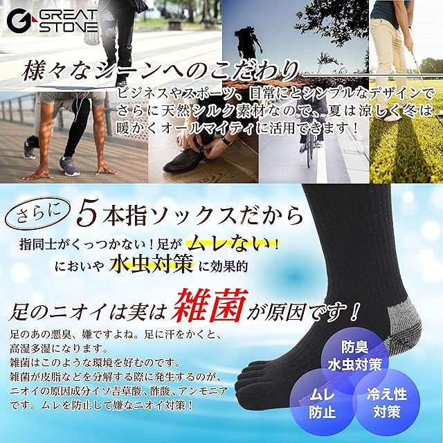 [GREAT STONE] メンズ 五本指 靴下 ソックス【6足セット】 5本指 くつした タフ 丈夫 二重底 裏シルク 厚手 作業用 吸汗速乾 25~27㎝ (カラーミックス)